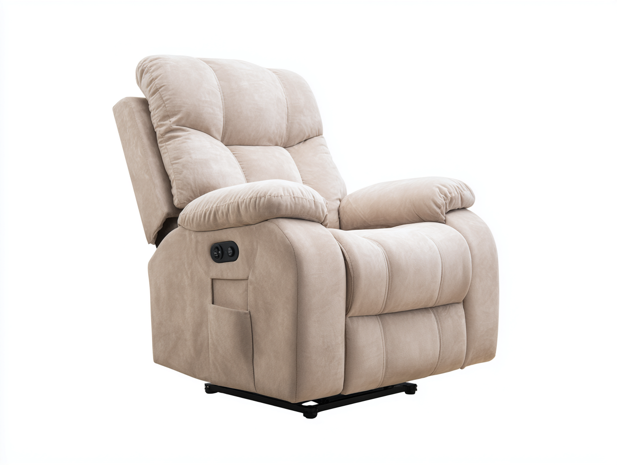Der Bezug besteht aus Stoff in Beige und verleiht dem Sessel eine warme und wohnliche Ausstrahlung. Die Oberfläche wirkt weich und angenehm im Gebrauch. Die gepolsterte Konstruktion sorgt für komfortables Sitzen und ist für den regelmäßigen Einsatz im Wohnbereich ausgelegt.